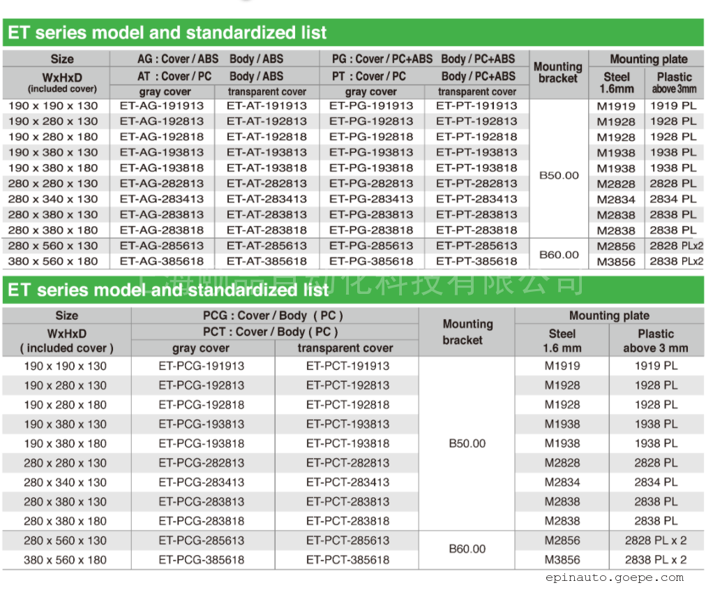 特性 聚碳酸酯(PC) 聚碳酸酯(PC) 防护等级 IP 68 (IEC60529) IP 68 (IEC60529) 冲击防护等级 IK 08回 完全绝缘 IK 08回 完全绝缘 标准颜色 浅灰色 (RAL 7035) 无色透明 温度范围 -40℃~+115℃ -40℃~+115℃ RTI. Elec. / Imp. / Str. Max. +125℃ / +115℃ / +125℃ Max. +125℃ / +115℃ / +125℃ 防火等级 UL 94-V0 UL 94-V0 抗UV UL746Cf1, ⊿E9.2@1000h UL746Cf1 无毒产品 无卤素 无卤素 密封圈材质 聚氨酯 聚氨酯 ET系列特点